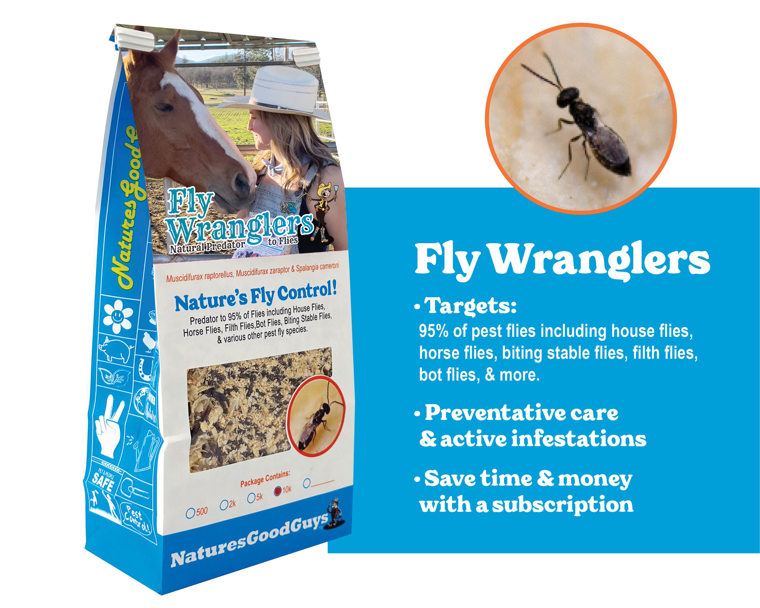 Our Fly Wranglers (A.K.A. Fly Exterminators) are a predator to 95% of flies, including house flies, lesser houseflies, horse flies, filth flies, bot flies, biting stable flies, and various other fly species.