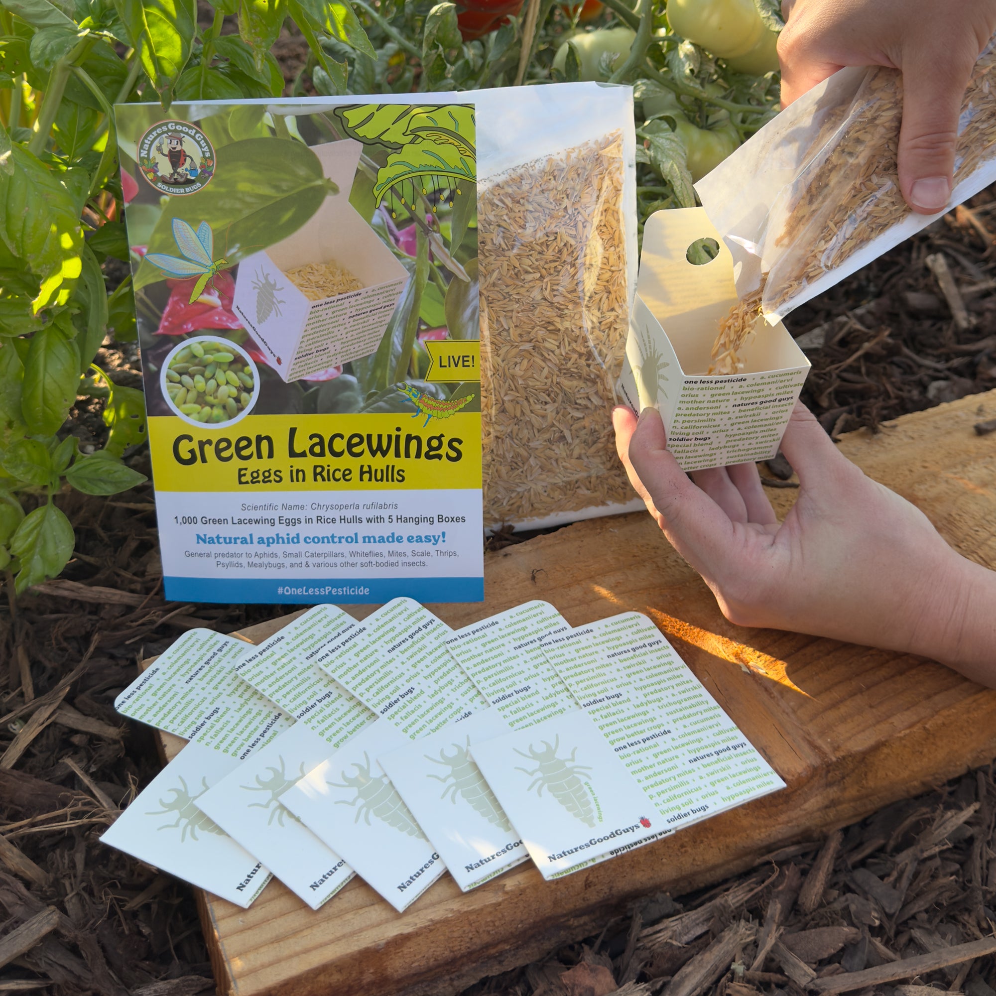 Each pack of lacewing eggs in rice hulls will include hanging boxes according to the quantity that was ordered.