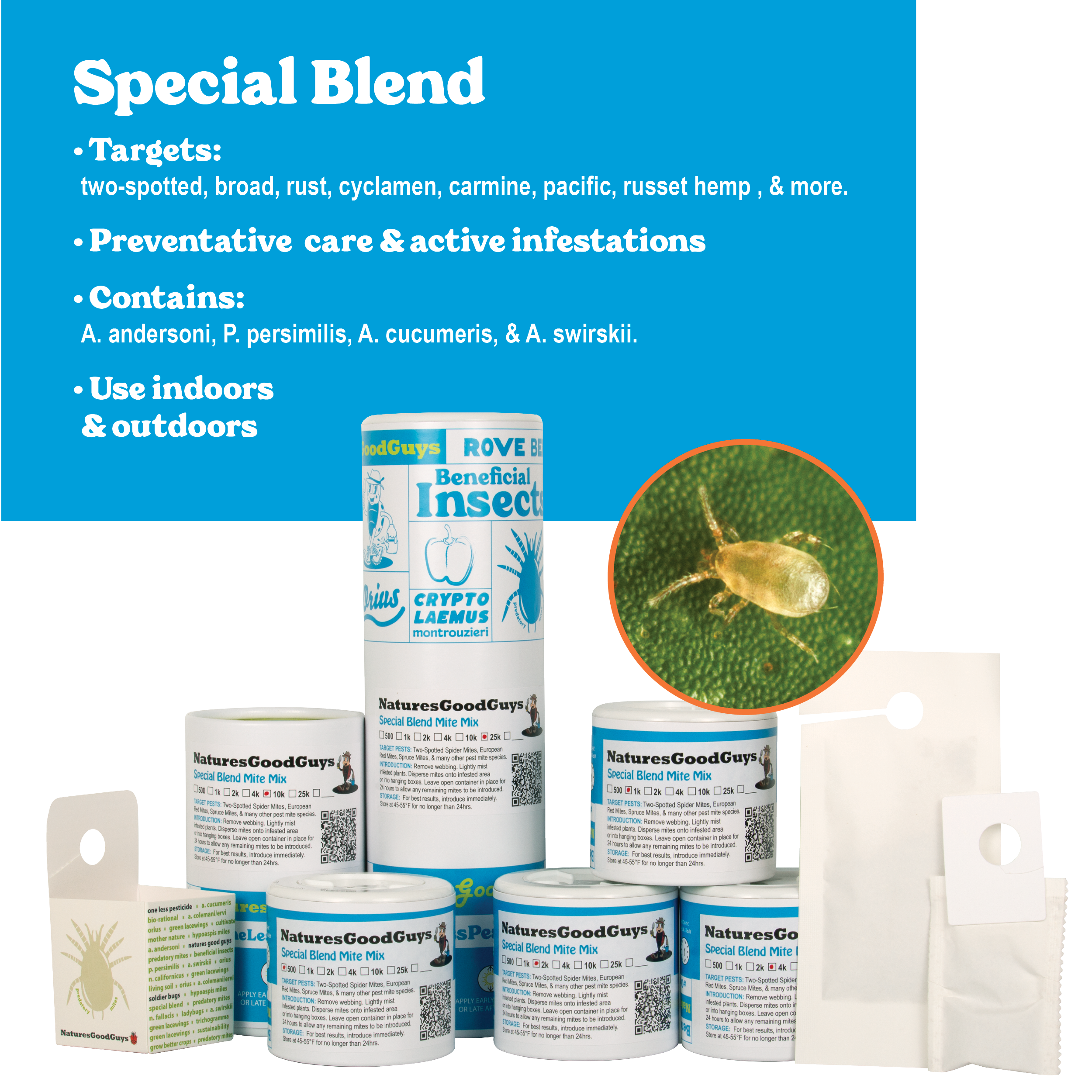 Take the guesswork out of which mite species you have with our Special Blend Mite Mix. Versatile mix of Amblyseius andersoni, Amblyseius cucumeris, Phytoseiulus persimilis, and Amblyseius swirskii.